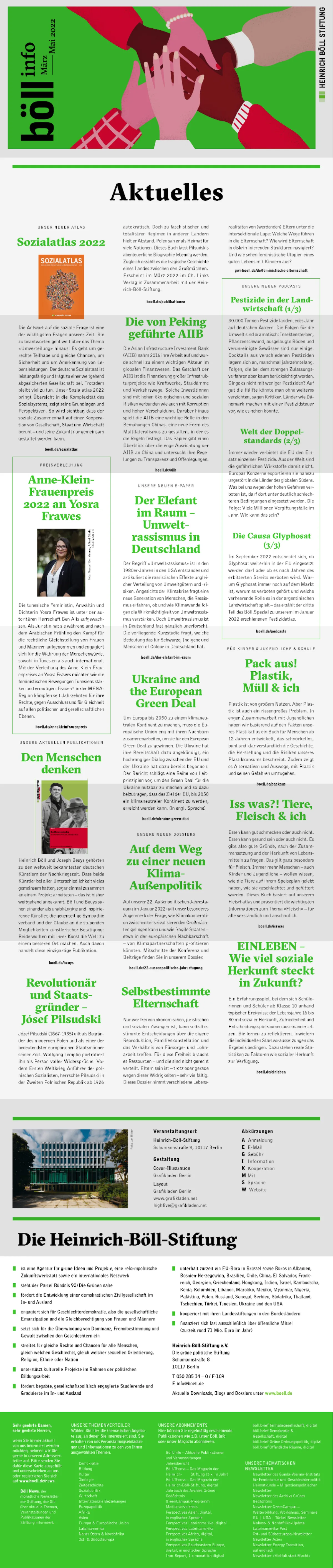 Böll.Info ist das Kalenderblatt der Heinrich Böll Stiftung. Quartalsweise wird hier über Publikationen, Veröffentlichungen und Veranstaltungen informiert. Passend zum aktuellen Themenfokus gestalten wir das Cover und kümmern uns außerdem um Layout und Gestaltung der Publikation.